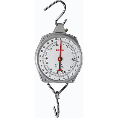 In alluminio, con doppio gancio in acciaio. Scala di misurazione chilogrammi/libbre. Con regolazione della tara. Divisione pesata Kg. 25/Gr. 100.
