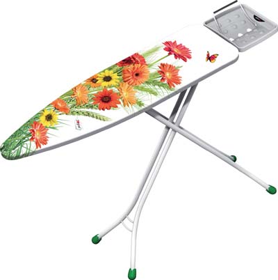 In acciaio. Dotata di poggiaferro con archetto di appoggio reversibile, adatto anche per mancini. Struttura gambe a sezione tonda. Copriasse 100% cotone con imbottitura in mollettone. Piano di stiratura Cm. 110x33.