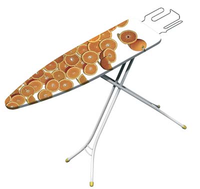 In acciaio. Dotato di poggiaferro a filo. Struttura gambe a sezione tonda. Copriasse 100% cotone con imbottitura in mollettone. Piano di stiratura Cm. 110x33.