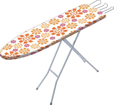 In acciaio. Poggiaferro a filo. Altezza regolabile. Foderina 100% cotone con imbottitura in spugna. Piano di stiratura Cm. 114x33.