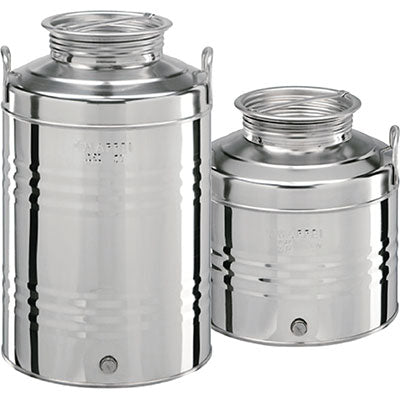 In acciaio inox alimentare. Aggraffato sul fondo e saldato lateralmente. Con predisposizione per rubinetto.