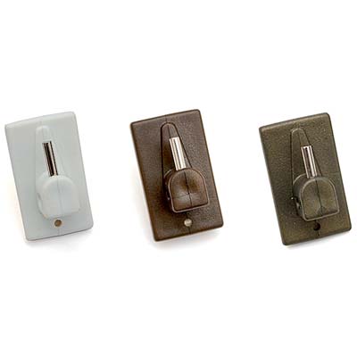 Con base in plastica di e rampino in metallo. Con foro per fissaggio e biadesivo. In blister.