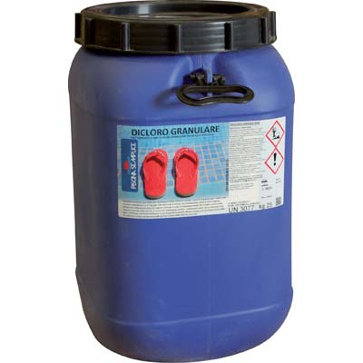 Sanificante in polvere, specifico per la clorazione dell'acqua di piscina (dicloro granulare al 56%). Rilascia cloro attivo stabilizzato in modo da rallentare la decomposizione e la perdita del cloro in occasione di giornate assolate su piscine scoperte. A rapida dissoluzione e assenza di residui idrosolubili. Idoneo per trattamenti shock periodici o per il recupero di acque verdi. Utilizzo: per il mantenimento Gr. 150-200 ogni Mc. 10 di acqua, per il trattamento shock raddoppiare la dose.