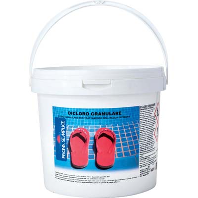 Sanificante in polvere, specifico per la clorazione dell'acqua di piscina (dicloro granulare al 56%). Rilascia cloro attivo stabilizzato in modo da rallentare la decomposizione e la perdita del cloro in occasione di giornate assolate su piscine scoperte. A rapida dissoluzione e assenza di residui idrosolubili. Idoneo per trattamenti shock periodici o per il recupero di acque verdi. Utilizzo: per il mantenimento Gr. 150-200 ogni Mc. 10 di acqua, per il trattamento shock raddoppiare la dose.