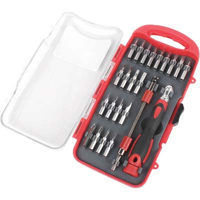Set composto da 23 pezzi. 1 impugnatura e 1 adattatore flessibile. 21 inserti di precisione da 5/32"x1-1/8": PH 000, 00, 0 e 1; T 5, 6, 7, 8, 9, 10, 15 e 20; taglio Mm. 1,5, 2, 2,5, 3 e 4; esagonali Mm. 1,5, 2, 2,5, 3, 4.