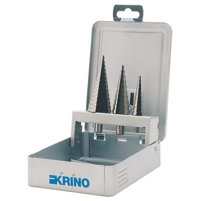 Kit con astuccio in ABS. Composto da frese a gradini HSS-G. Misure: Gr. 2, Mm. 4-12; Gr. 4, Mm. 4-20; Gr. 6, Mm. 4-30.