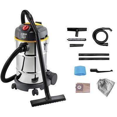 Semi professionale per secco e liquido. Nuovo motore che garantisce una potenza di aspirazione di Lt./Sec. 60 con un risparmio energetico del 50%. Fusto in acciaio inox con chiusura a ganci in acciaio. Dotato di 2 ruote pivottanti. Depressione massima mbar. 220. Peso Kg. 7,5. Cavo elettrico da Mt. 4. Accessori in dotazione: tubo flessibile da Mt. 2, 2 prolunghe da Cm. 45, corpo spazzola con bocchetta per solidi e liquidi, lancia piatta, filtro in carta (Art. 74.601.24), filtro in microfibra (Art. 74.601.44) e filtro in spugna (Art. 74.601.46). Servizio di assistenza a domicilio.