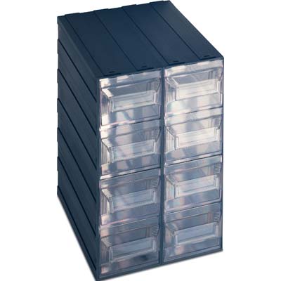 Struttura in plastica nera resistente. Con cassetti trasparenti dotati di porta etichetta frontale. Sistema modulare.