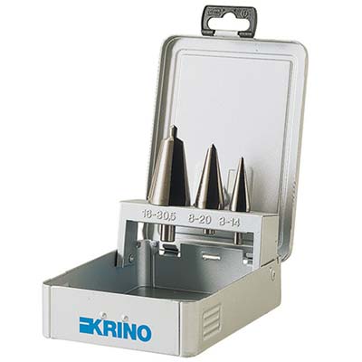 Kit con astuccio in metallo. Composto da 3 frese a gradini HSS-G. Misure: Gr. 1, Mm. 3-14; Gr. 2, Mm. 6-20; Gr. 3, Mm. 16-30,5.