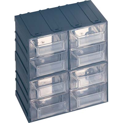 Struttura in plastica nera resistente. Con cassetti trasparenti dotati di porta etichetta frontale. Sistema modulare.