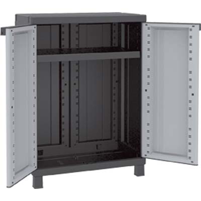Con tre ante, composto da due vani separati con 3 ripiani interni regolabili e 1 appenditutto. Dotato di piedini rialzati e predisposizione per il lucchetto. In plastica resistente di colore grigio e nero. Capacità di carico per singolo ripiano Kg. 20. Resistente alla pioggia.